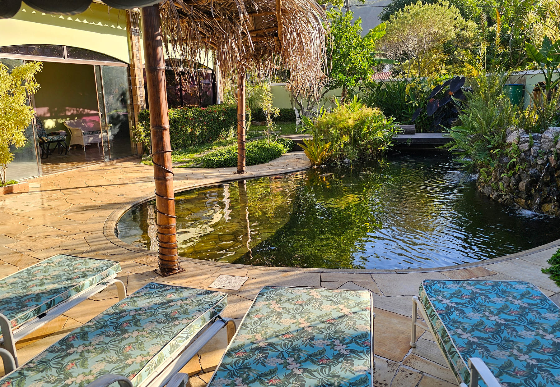 Com áreas cercada por plantas, árvores frutíferas e piscina natural que faz você se sentir numa casa de Campo dentro de um condomínio fechado onde você pode passear e curtir o dia e a noite.